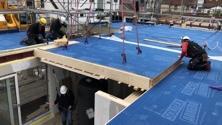 Uitstekende bescherming tegen transportvocht, wanneer houtskeletbouwelementen in de werkplaats al van een laag SOLITEX ADHERO worden voorzien