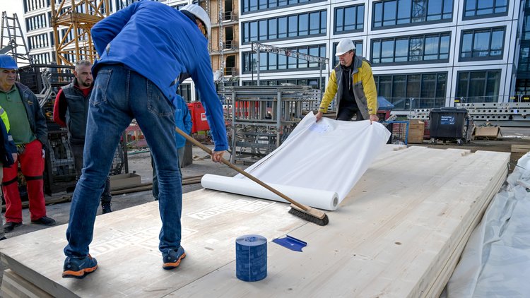 Aanzienlijk dunner dan bitumen bekleding: wanden kunnen direct op de beplakte CLT-vloer worden geplaatst zonder dat het geheel wordt verhoogd of er kleine afwijkingen in de maatvoering ontstaan.