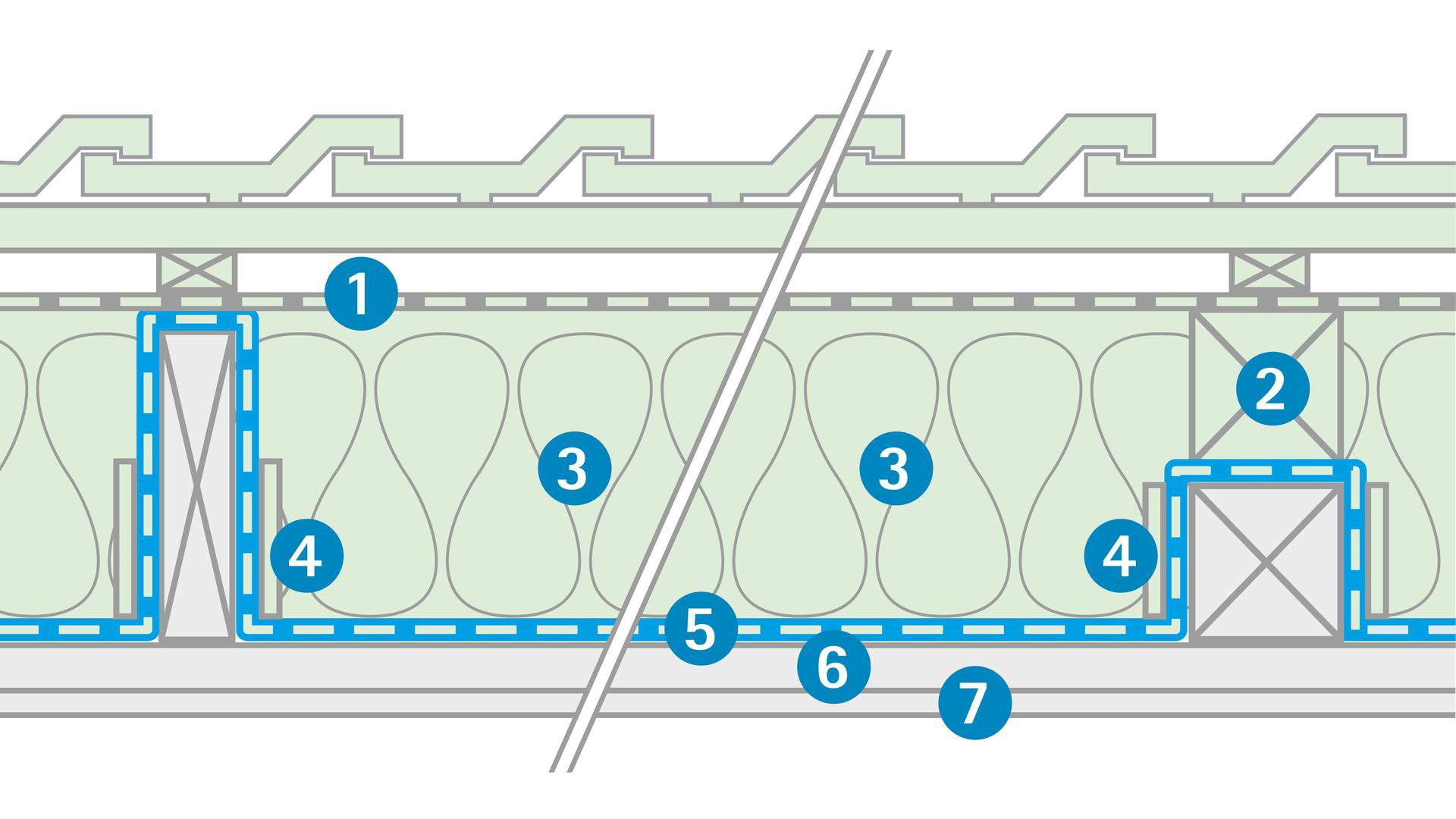Overeenkomstig DIN 4108-3 geschikt als dampremmende en luchtdichte 'berg-en-dal'-folie voor alle constructies met dampopen dakfolies (bijv. SOLITEX). De μd-waarde van de dakfolie op beschot mag maximaal 0,2 m zijn. Verder geschikt in combinatie met houtvezel- en MDF-onderdakplaten en met schuimplaten met vlies (PUR, PIR, EPS etc.) vanaf 50 mm dik.