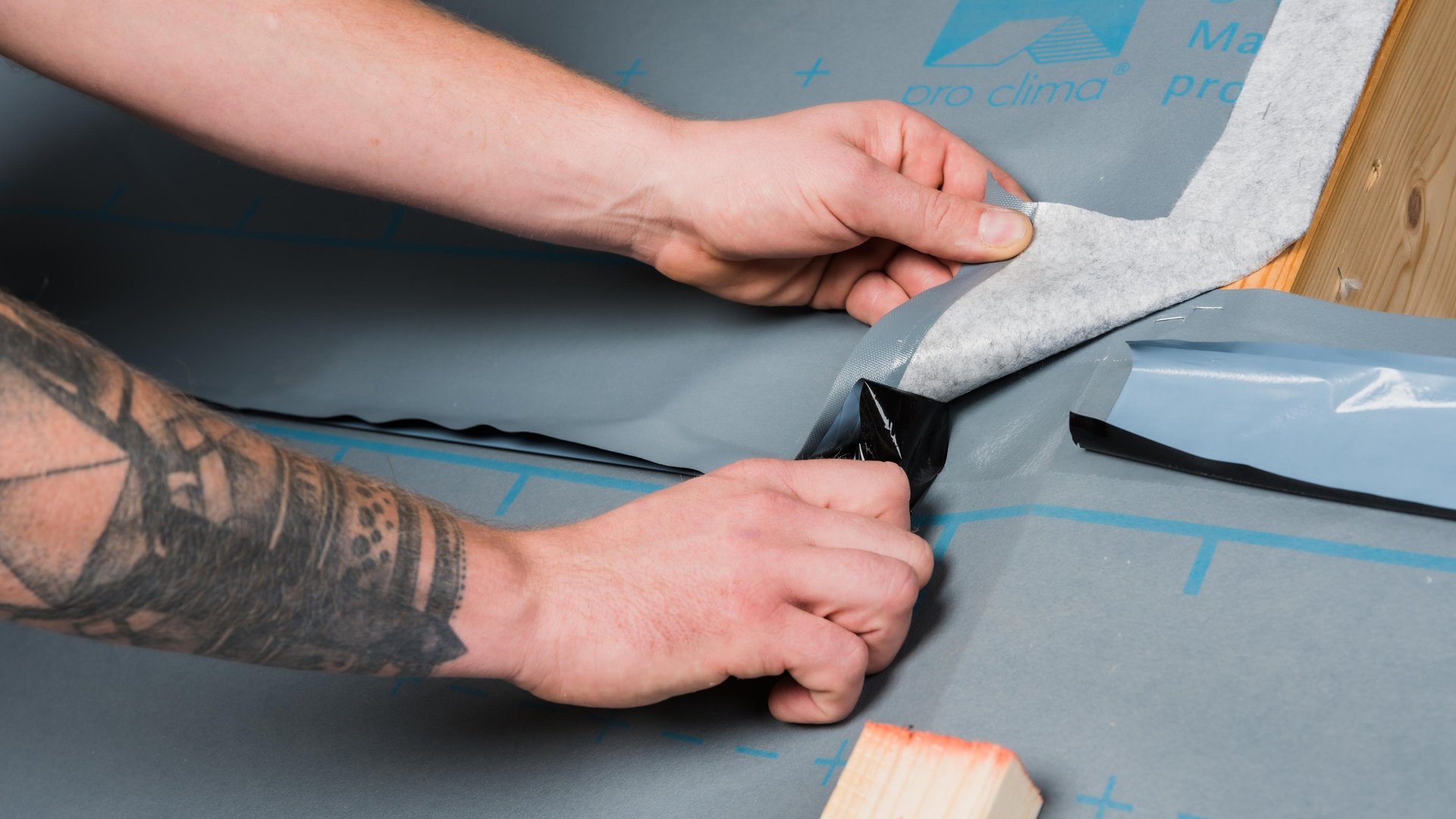 Verlijm beschadigingen in het folieoppervlak kreukvrij met de systeemtape TESCON VANA. Wrijf de overlappingen stevig aan met de pro clima PRESSFIX. Zorg voor voldoende tegendruk.
