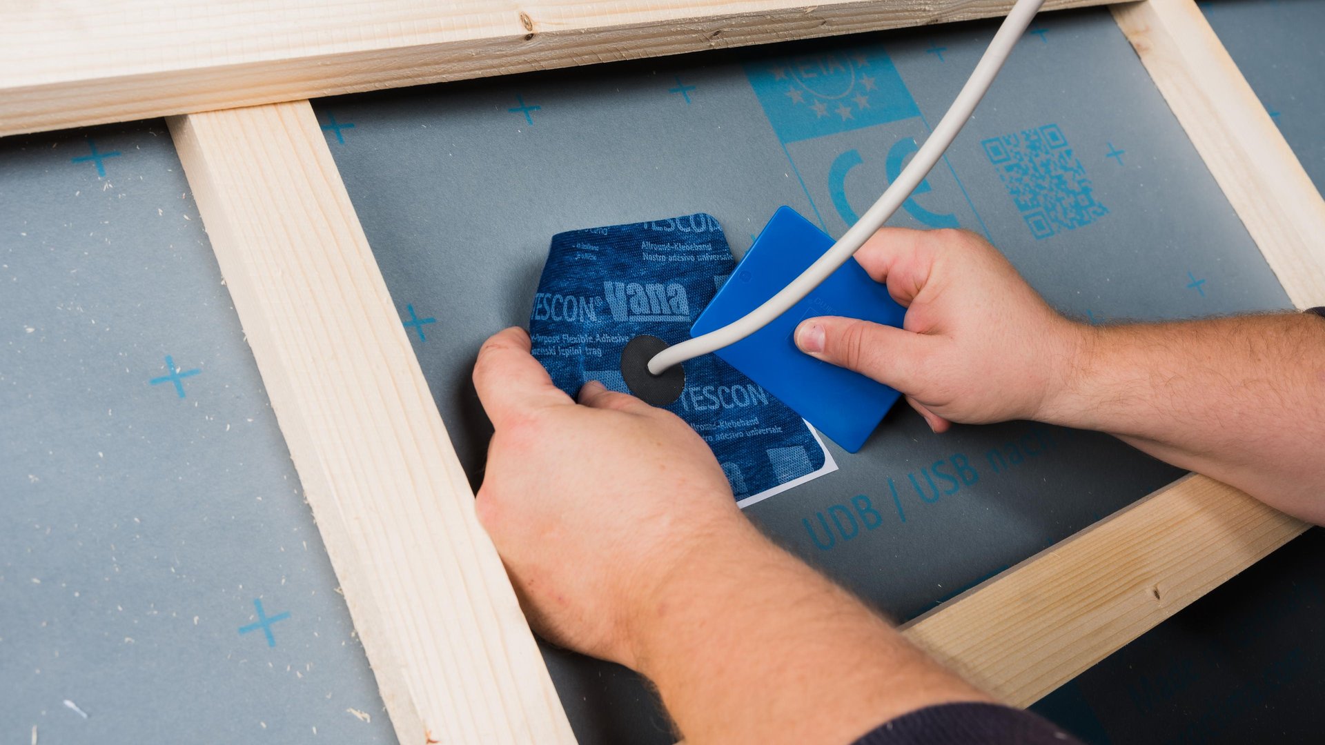 Met de systeemproducten worden doorvoeren en inbouwelementen duurzaam afgedicht. Let hierbij op een onbelaste en kreukvrije verlijming. Wrijf de overlappingen stevig aan met de pro clima PRESSFIX. Zorg voor voldoende tegendruk.