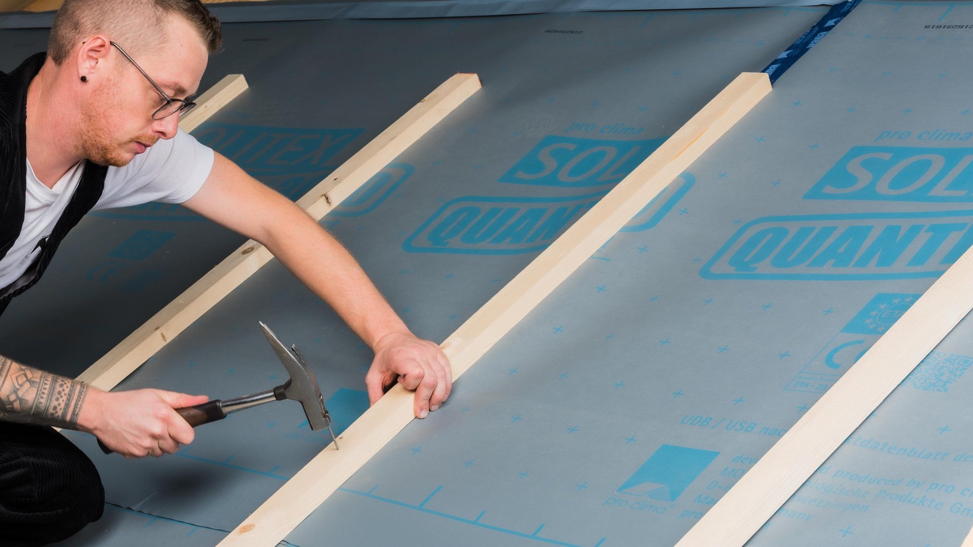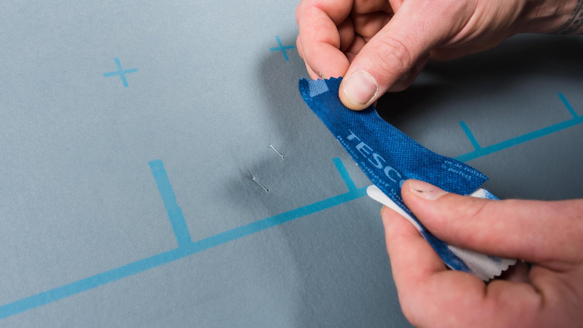 Niet de folie in de bovenste overlappingszone vast. Verlijm overige bevestigingsnieten in het folieoppervlak kreukvrij met de systeemtape TESCON VANA. Wrijf de overlappingen stevig aan met de pro clima PRESSFIX. Zorg voor voldoende tegendruk.