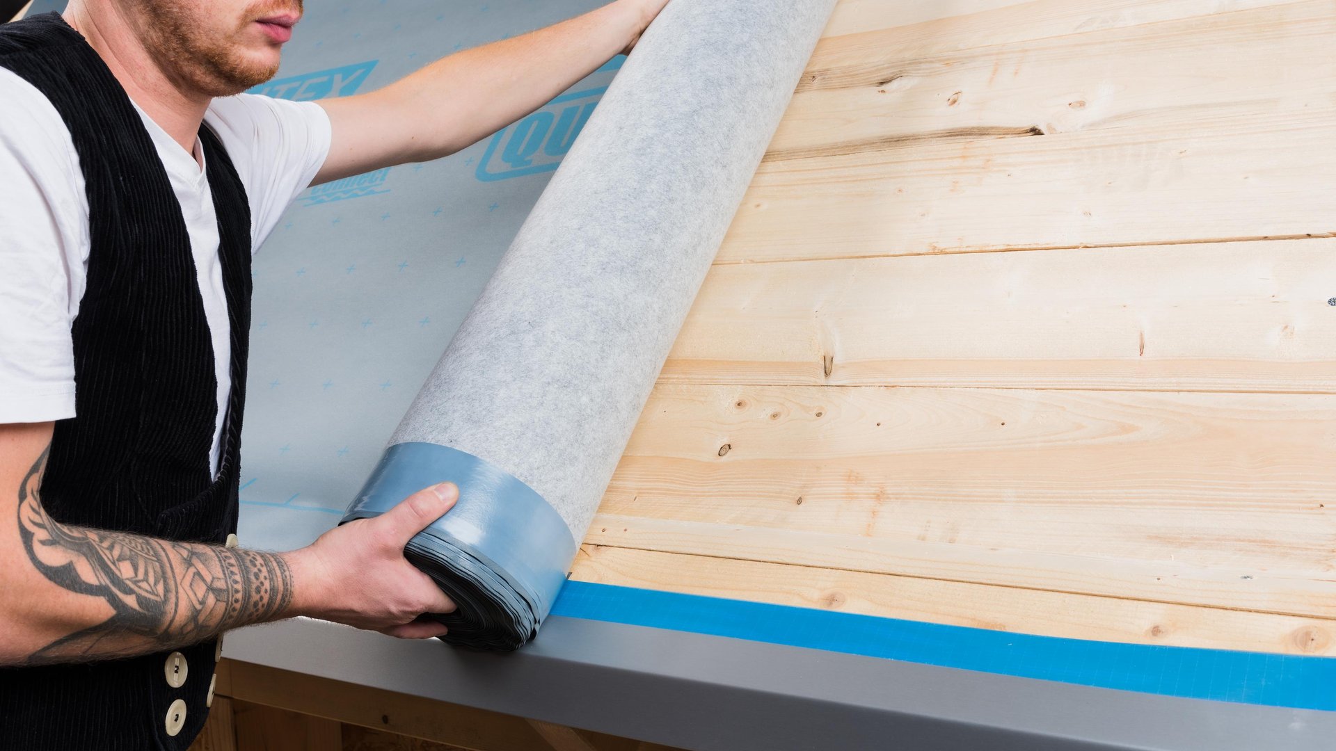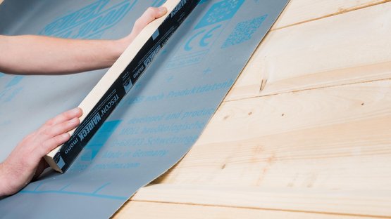 Leg de folie op het dakvoetprofiel en verlijm deze kreukvrij met de geïntegreerde zelfklevende connect-tape, de dubbelzijdige tape DUPLEX of de enkelzijdige systeemtape TESCON VANA.