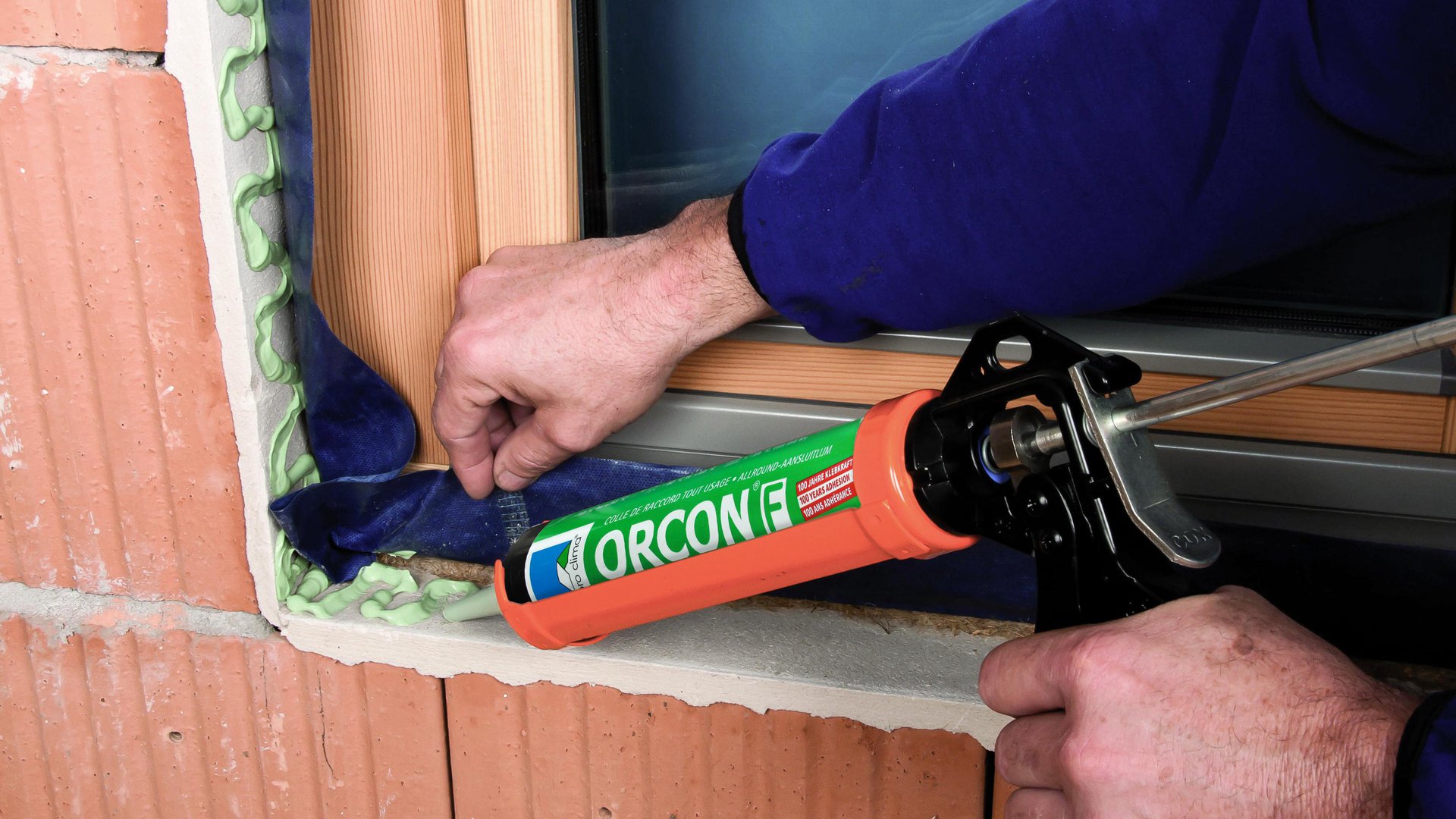 Raam in de dagkant monteren, vervolgens op de dagkant een ca. 5 mm brede kitrups van de kit ORCON F in een dichte zigzagbaan rondom aan brengen en de band