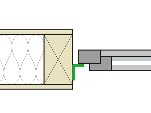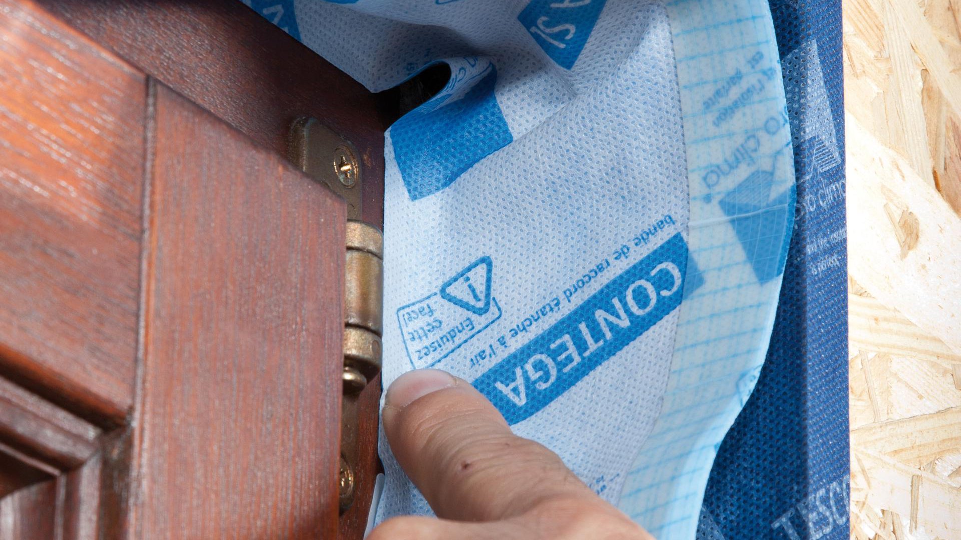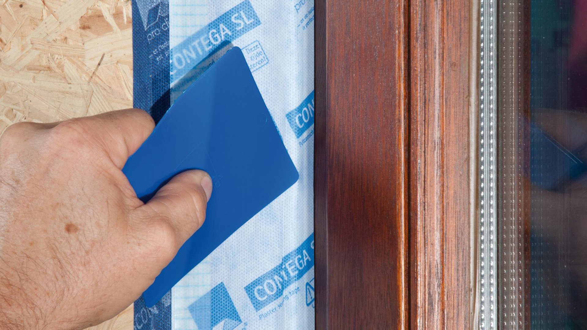 Band over de volle kleefstrookbreedte op het kozijn plaatsen en op de eerste kozijndagstukzijde verlijmen.