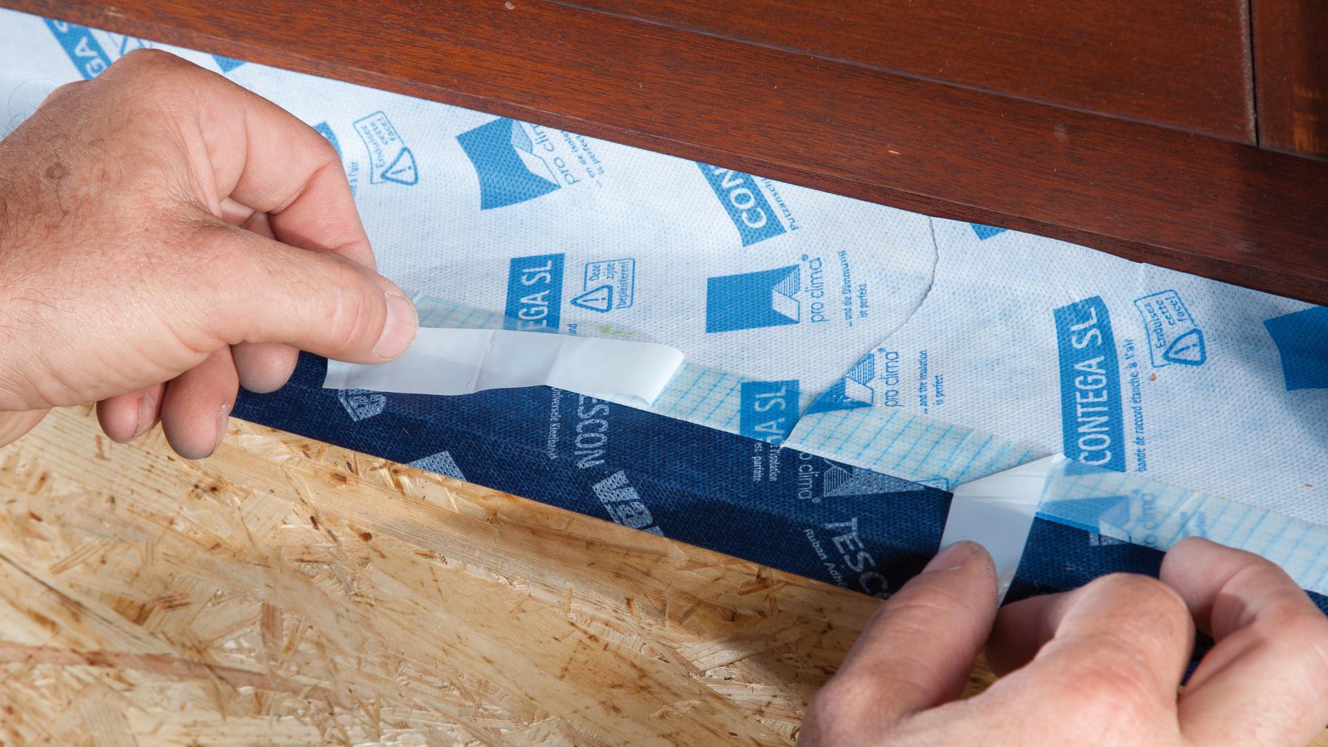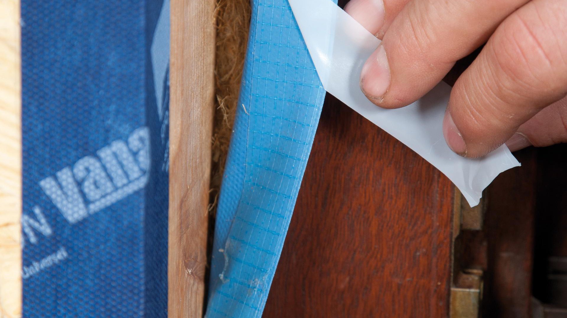 Tweede strook afdekfolie op de gladde membraanzijde verwijderen en de band rondom op het kozijndagstuk verlijmen.