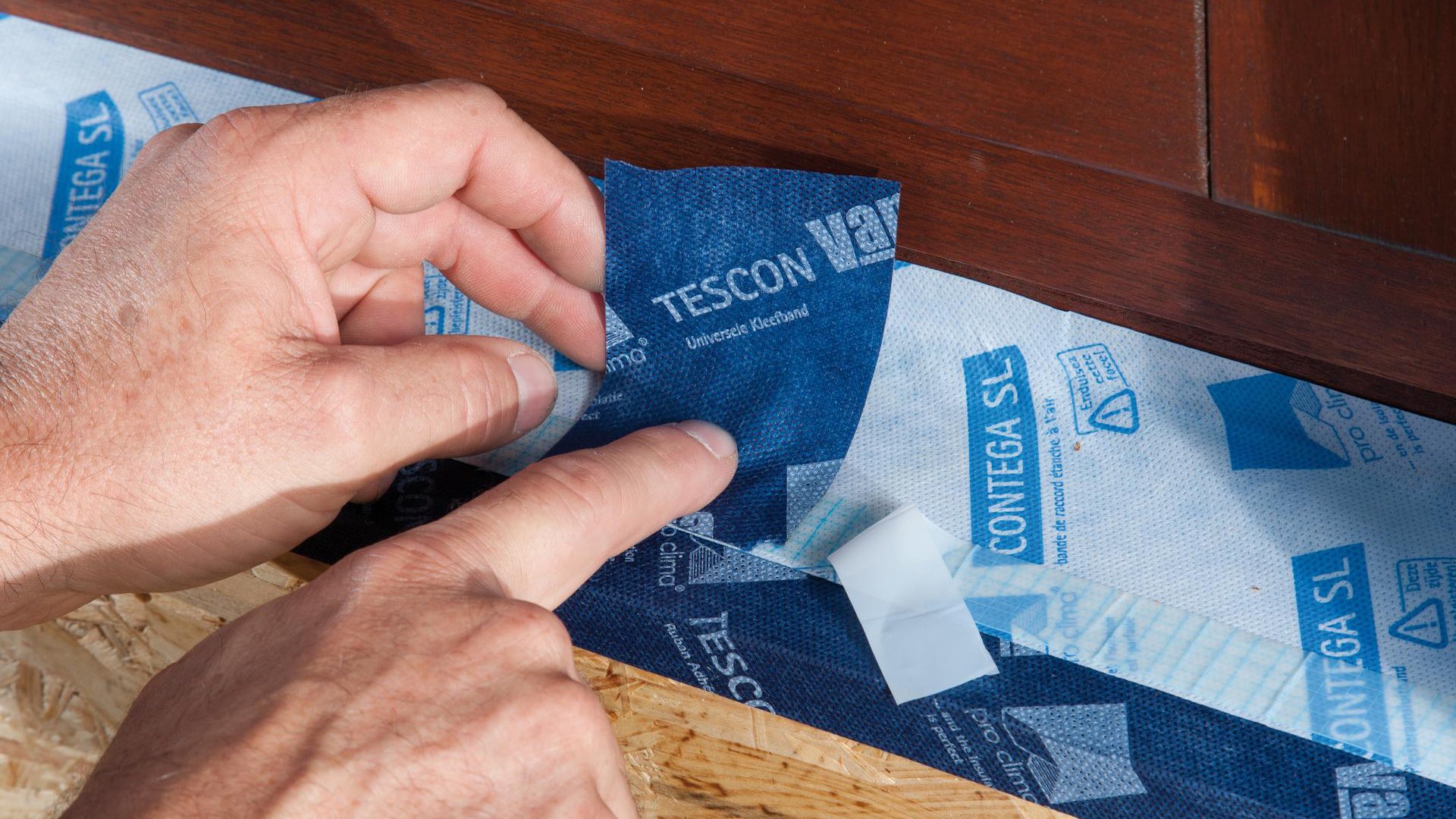 Overlappingsnaad van CONTEGA SL met een kort stuk allround tape TESCON VANA verlijmen.