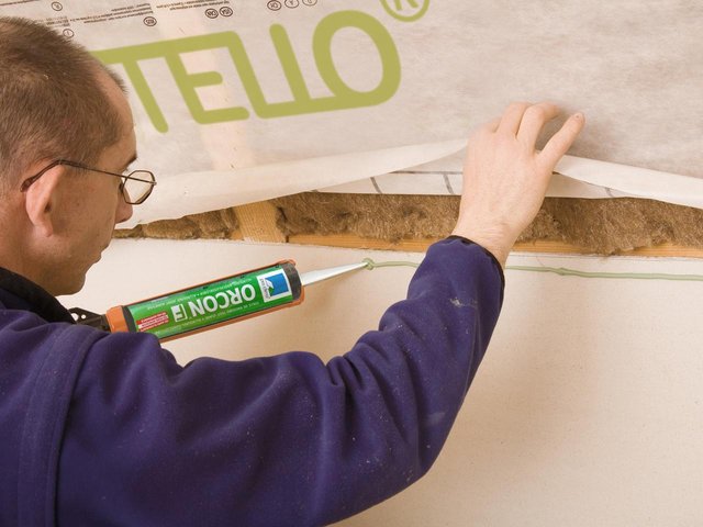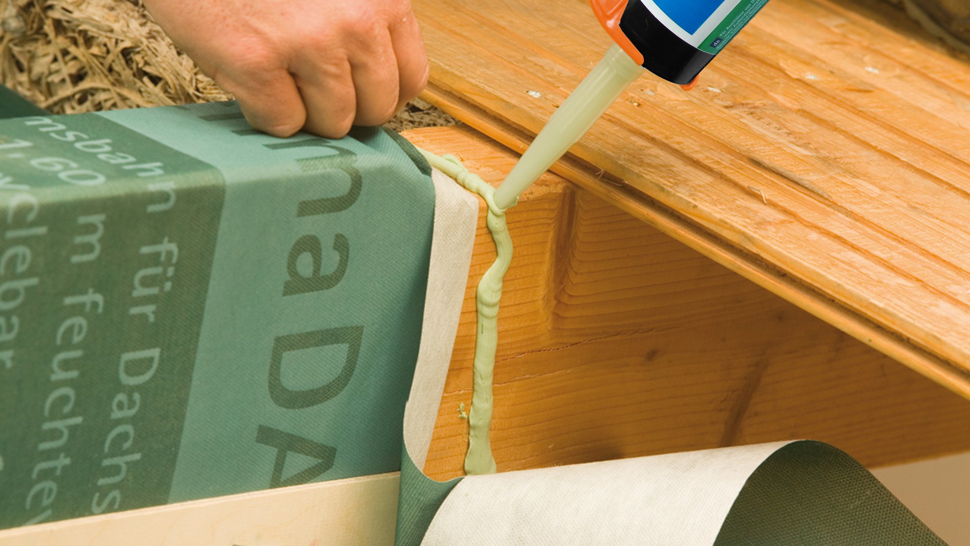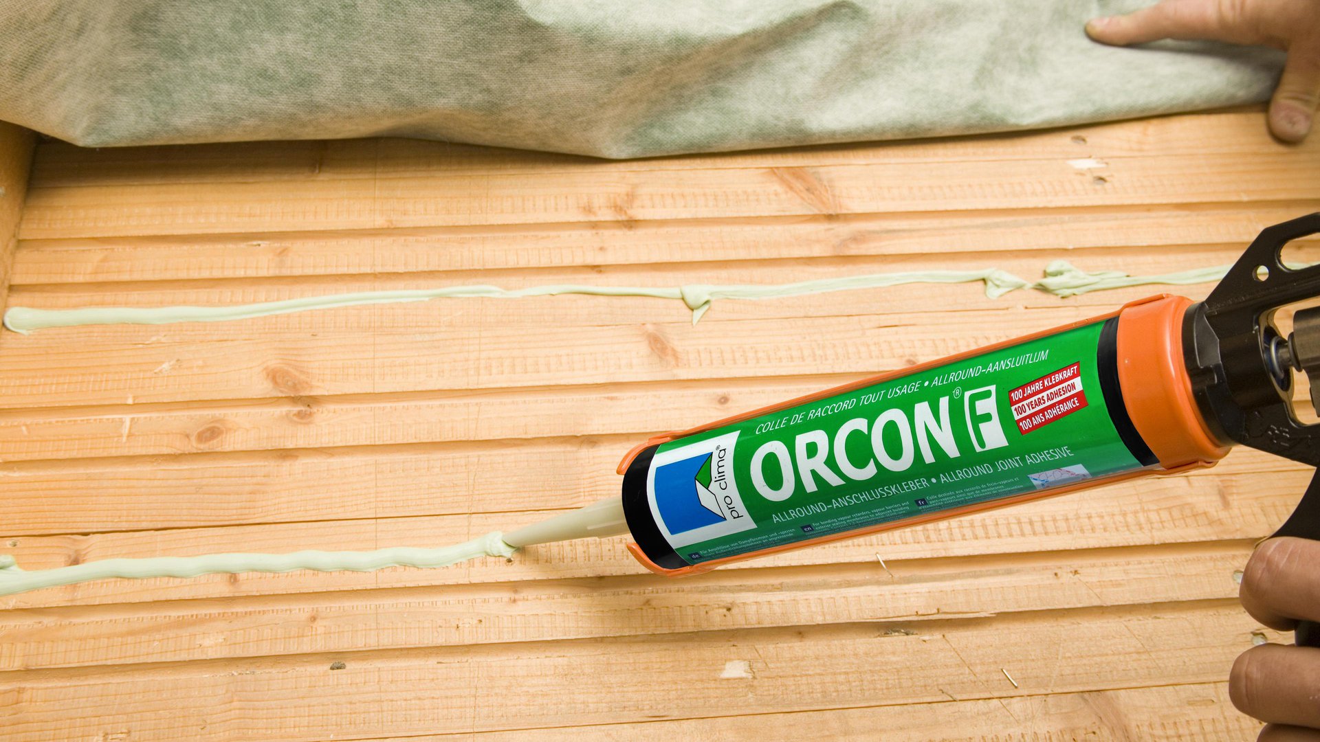Bij dakisolatie bij doorlopende kepers een dampremmende baan (bijv. pro clima DA) met 2 parallel lopende rupsen ORCON F op 2 profielplanken boven de dorpel vastlijmen.