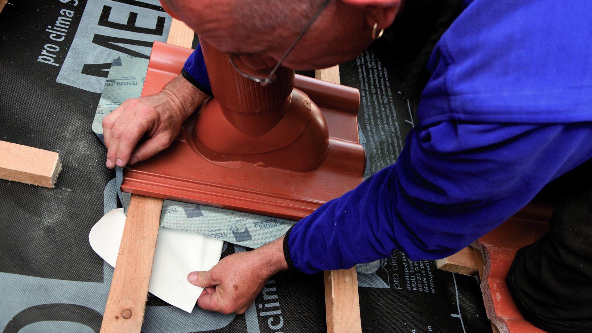 Manchet over de ontluchtingsbuis trekken, zodat de lange kant van de manchet straks naar de dakvoet wijst.